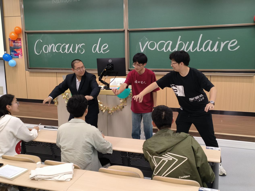 在同学们的精彩表现过后,是大家翘首以盼的彩蛋环节。由六名中方和法方的数理老师上场进行“传话”比赛。看着昔日在讲台上传道授业、被我们所敬仰的老师们如今也站到了赛场上与我们同台竞技,台下迸发出阵阵的掌声和欢笑声。