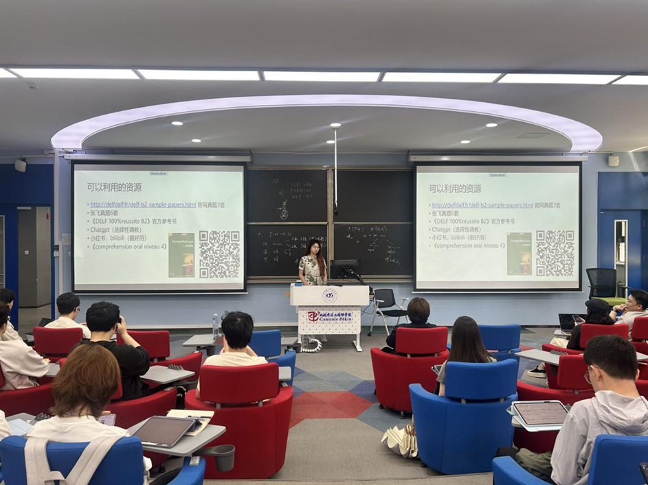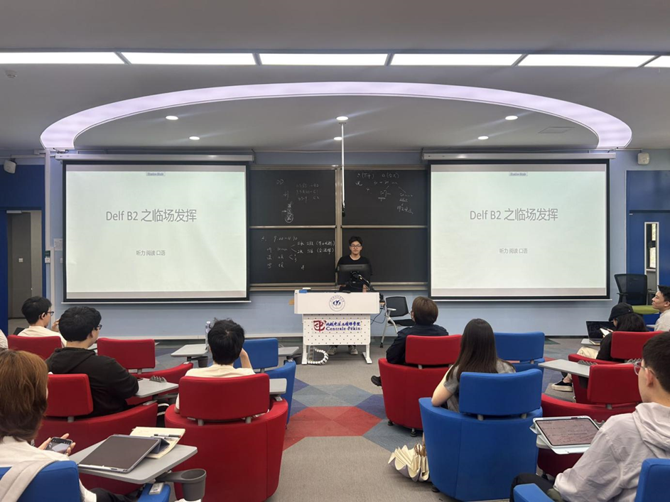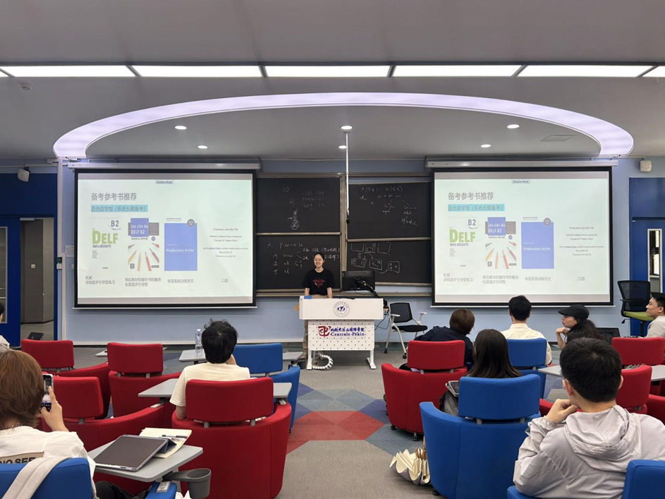 在此之后,黄子桐学姐和金泽翔学长则站在一般同学的角度,向大家分享了实用的DELF速通攻略。从听力的严格模拟考场时间到写作的考场时间控制,从个人高效的备考计划到大量的备考“宝藏”资源,宝贵的考试经验无疑大大增加了同学们通过考试的概率。