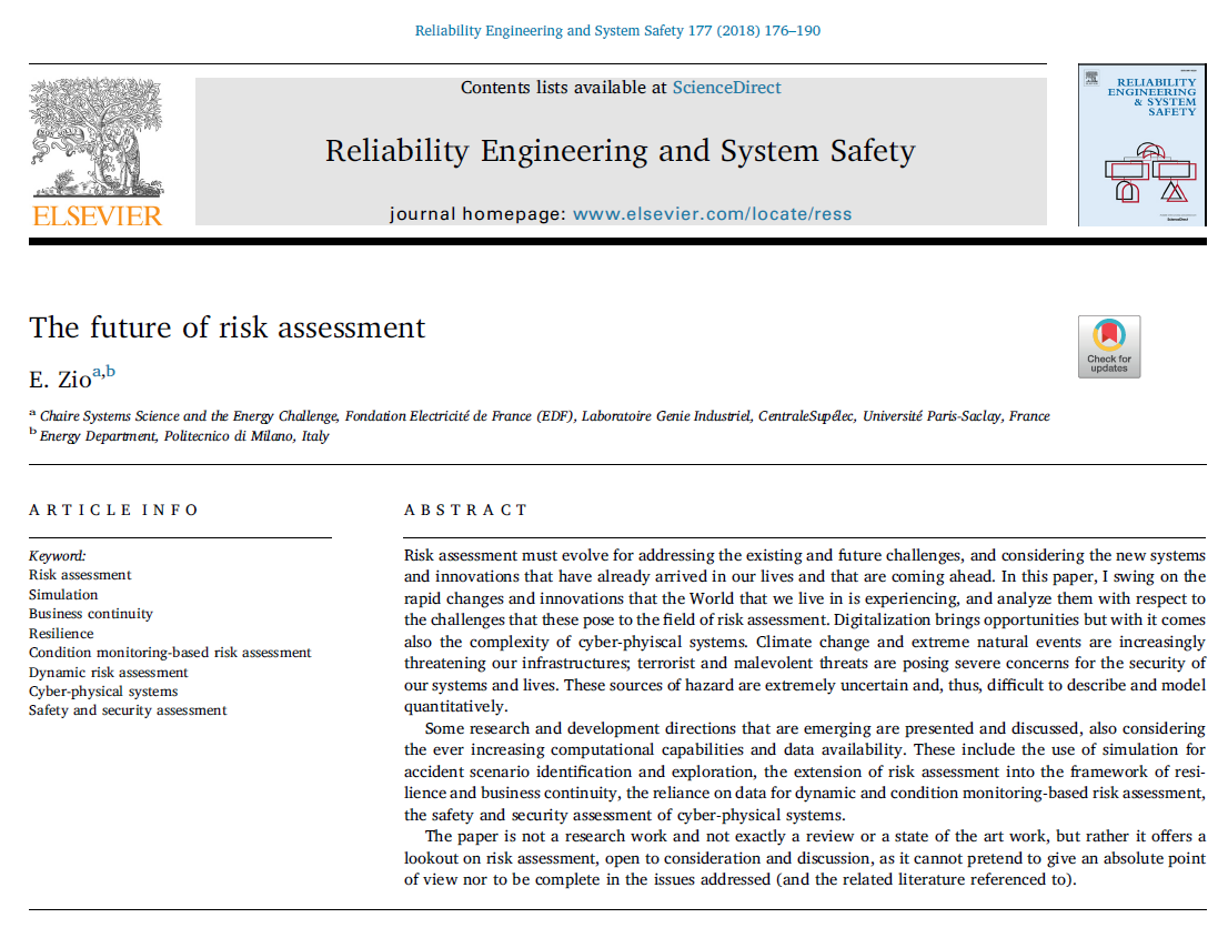 中法风险科学与工程实验室法方主任Enrico ZIO教授在可靠性领域顶级期刊《Reliablity Engineering & Systems Safety》发表一篇题为“The future of risk assessment”的文章。在本文中,考虑当前快速发展的计算能力和数据,Enrico ZIO教授介绍并讨论了当前的研究热点,主要包括:故障仿真、将风险评估扩展至弹性和商业可持续性、基于监测数据的动态风险评估、信息物理系统安全性与可靠性评估。